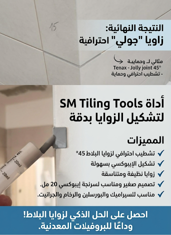 أداة عملية تساعد على سقاية الإيبوكسي في زوايا البلاط بدقة باستخدام السرنجة بعد قص البلاط بزاوية 45°.