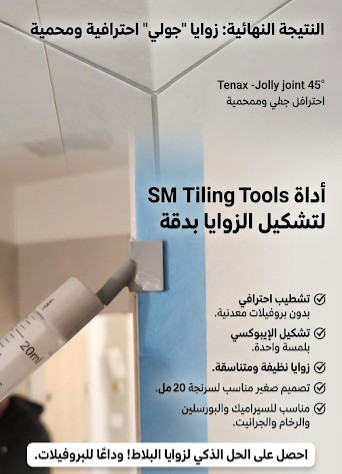 تساعد الأداة على إدخال الإيبوكسي داخل الفاصل بين البلاطتين بشكل متساوٍ، مما يعطي زاوية نظيفة ومتناسقة بدون الحاجة إلى استخدام بروفيلات أو فواصل معدنية.